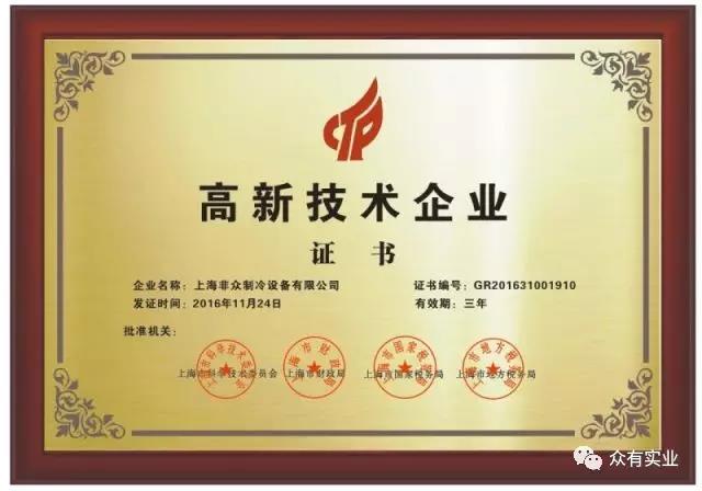 獲得高新技術(shù)企業(yè)認證,證明了非眾制冷在本領(lǐng)域中具有較強的技術(shù)創(chuàng)新能力、高端技術(shù)開發(fā)能力。