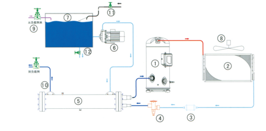 1、壓縮機 2、殼管式冷凝器 3、干燥過濾器 4、熱力膨脹閥 5、干式蒸發器 6、不銹鋼水泵 7、水箱